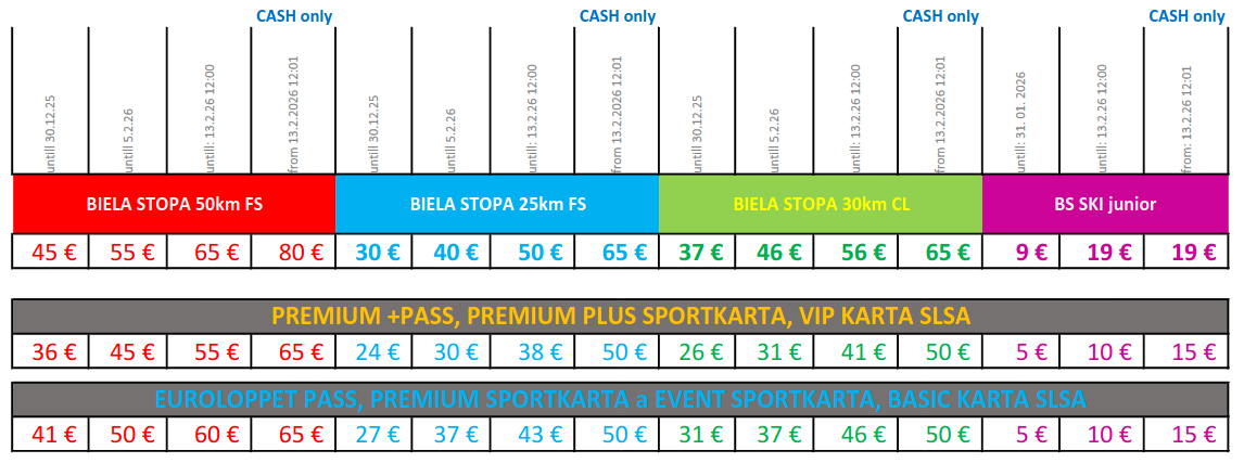 • Nárok na bezplatný štart majú víťazi v absolútnom poradí v predchádzajúcom ročníku a pretekári, ktorí sa zúčastnili doteraz všetkých ročníkov Bielej stopy.
